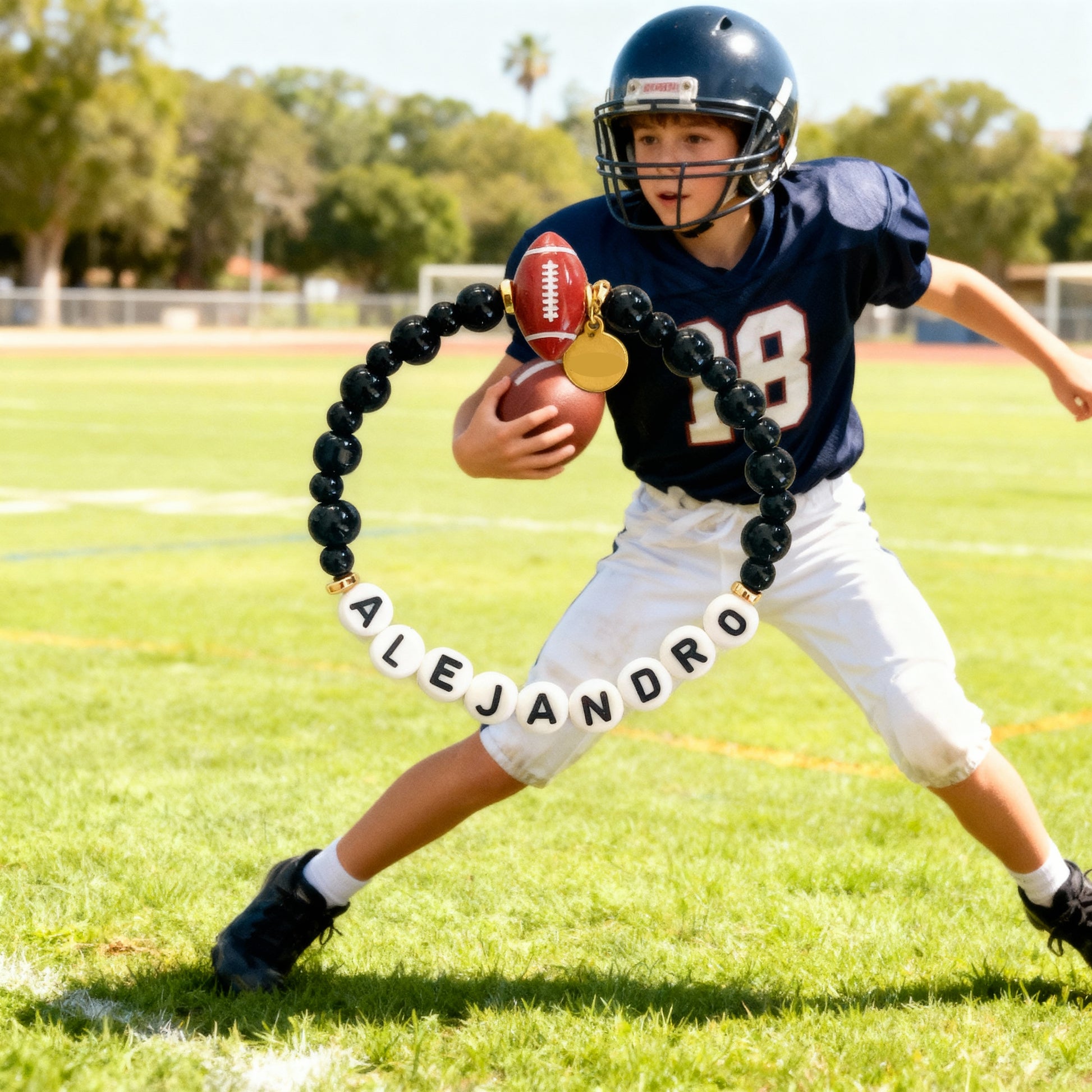 - Pulsera personalizada con nombre y charm deportivo